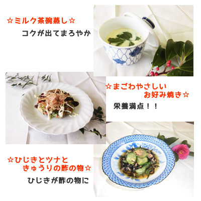 今回は他に「ミルク茶碗蒸し」「切干大根とひじきのサラダ」「まごわやさしいお好み焼き」も作りました。